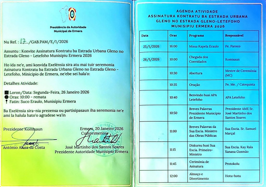 Prezidente Autoridade Munisipiu Ermera mos Konvida Komunidade no Entidade sira hotu atu mai Asiste Assina Kontratu ba Rehabilitasaun Estrada Refere ho Agenda hanesan iha Anexu